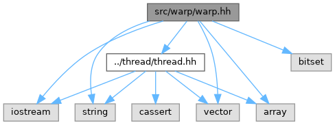 | | Represents a GPU warpThe Warp class encapsulates the state and behavior of a GPU warp, including its ID, program counter, threads, active mask, and current instruction. A warp is a group of threads that execute instructions in lockstep. Each warp has 32 threads in this project. To be added: reconvergence stack to handle divergent control flow. More...